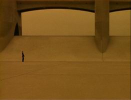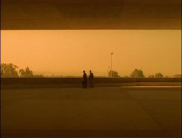Both of the above examples come from the film Gattaca. Note the carefully composed widescreen shots on the left, emphasizing the smallness of the humans in relation to the enormous, carefully framed and symmetrical backgrounds. Both the scale and the symmetry of the backgrounds are destroyed by the panning & scanning process, decreasing the impact of these scenes. |