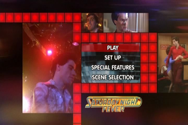 An example of the chroma upsampling error can be seen in the (animated) main menu of the Region 1 release of Saturday Night Fever. The menu is in NTSC and the DVD-2900 detects it as 2:2 progressive. This is the full frame as captured on PowerDVD 4.0 (click on the image to see an enlarged 720x480 version):