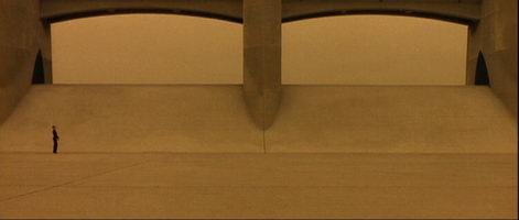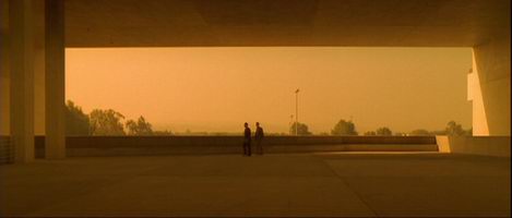Both of the above examples come from the film Gattaca. Note the carefully composed widescreen shots on the left, emphasizing the smallness of the humans in relation to the enormous, carefully framed and symmetrical backgrounds. Both the scale and the symmetry of the backgrounds are destroyed by the panning & scanning process, decreasing the impact of these scenes. |